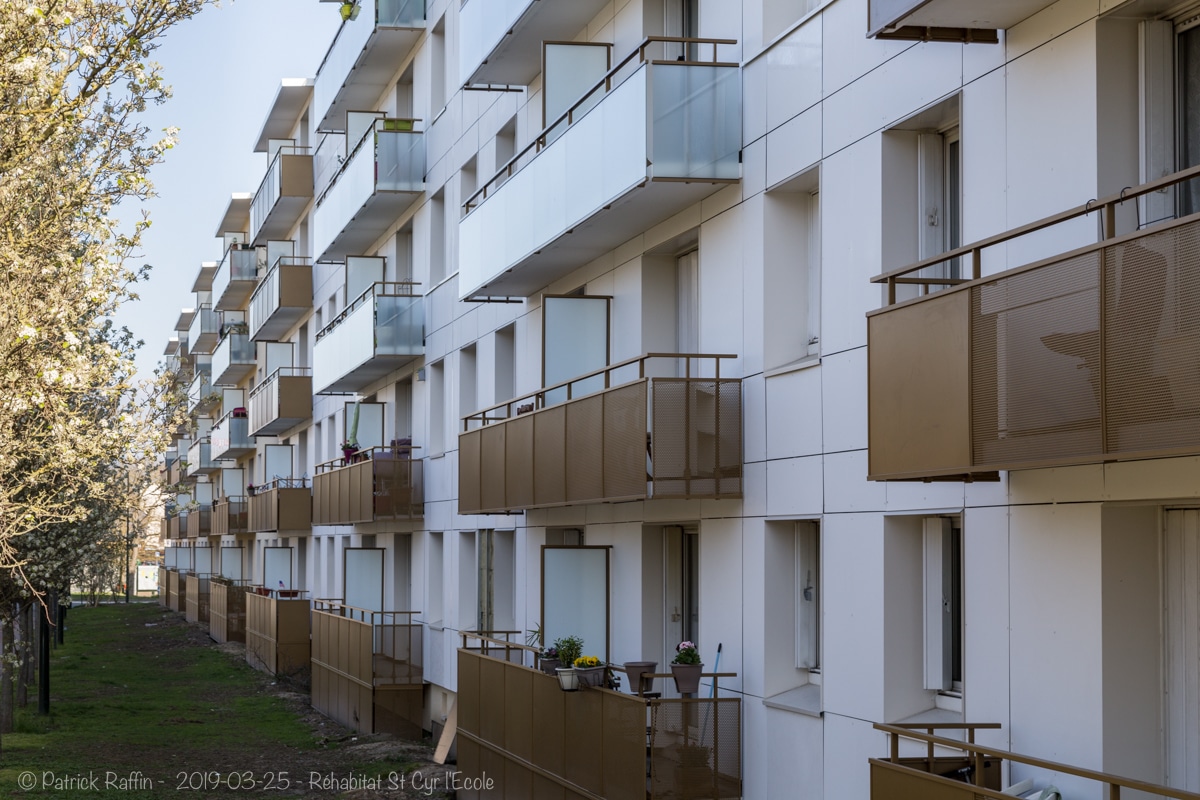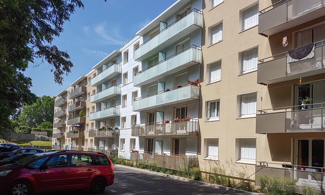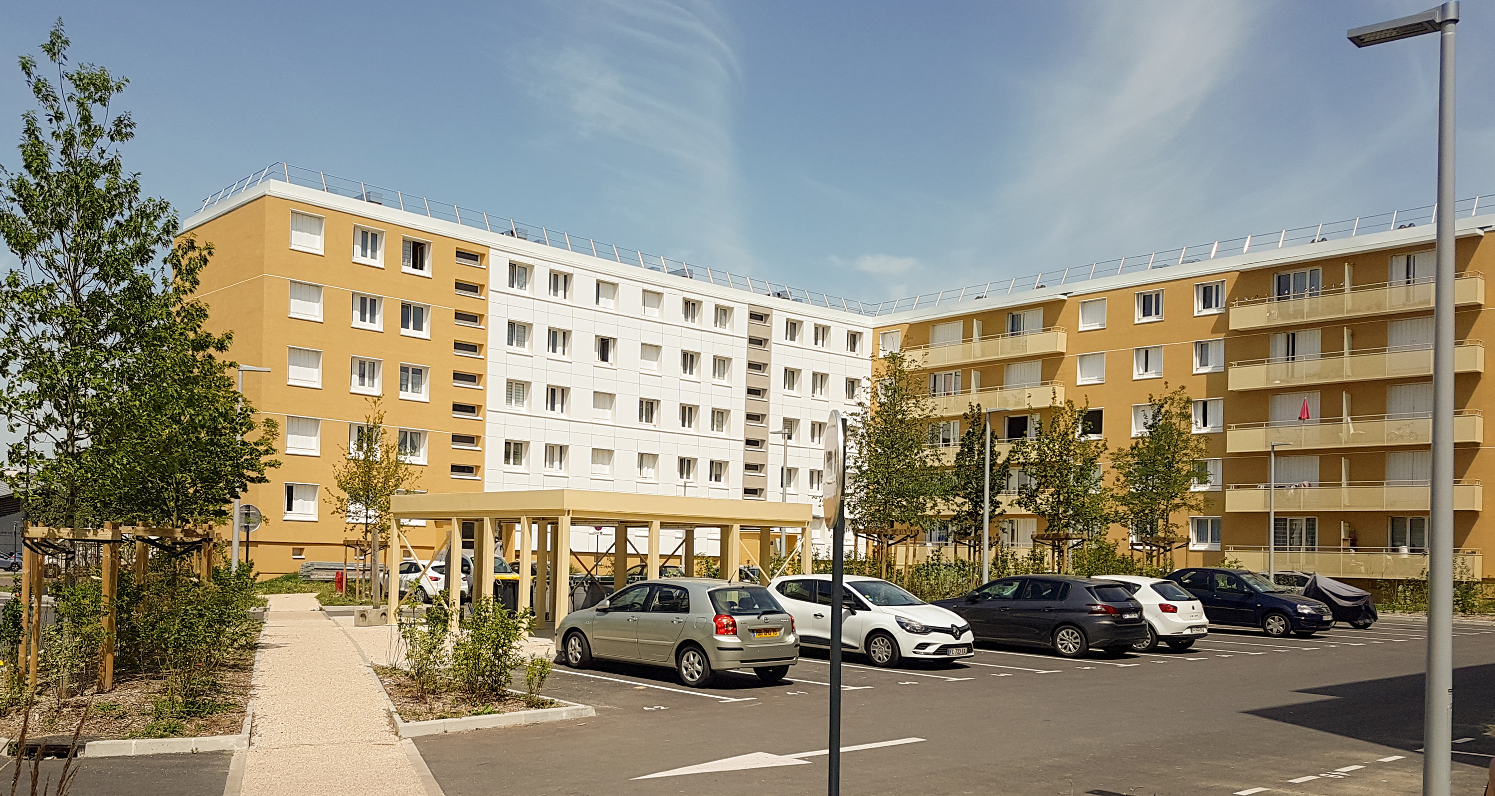 Dans un secteur dominé par les grands ensembles de logements collectifs, le programme est composé de trois bâtiments de l’architecte Paul Lagneau qui n’avaient encore jamais été réhabilités. Le traitement architectural des façades et de la toiture terrasse a fait l’objet d’une isolation extérieure afin de garantir une meilleure gestion des dépenses énergétiques. Un enduit de couleur et des panneaux stratifiés créent des séquences et respectent l’architecture de style « barre ». Réduites à une échelle plus « douce », les façades garantissent à chaque bâtiment une identité propre et confèrent un effet d’évanescence, grâce aux matériaux utilisés pour les balcons : tôle, verre. Les lieux sont valorisés par la plantation d’arbres, de haies et de massifs.
