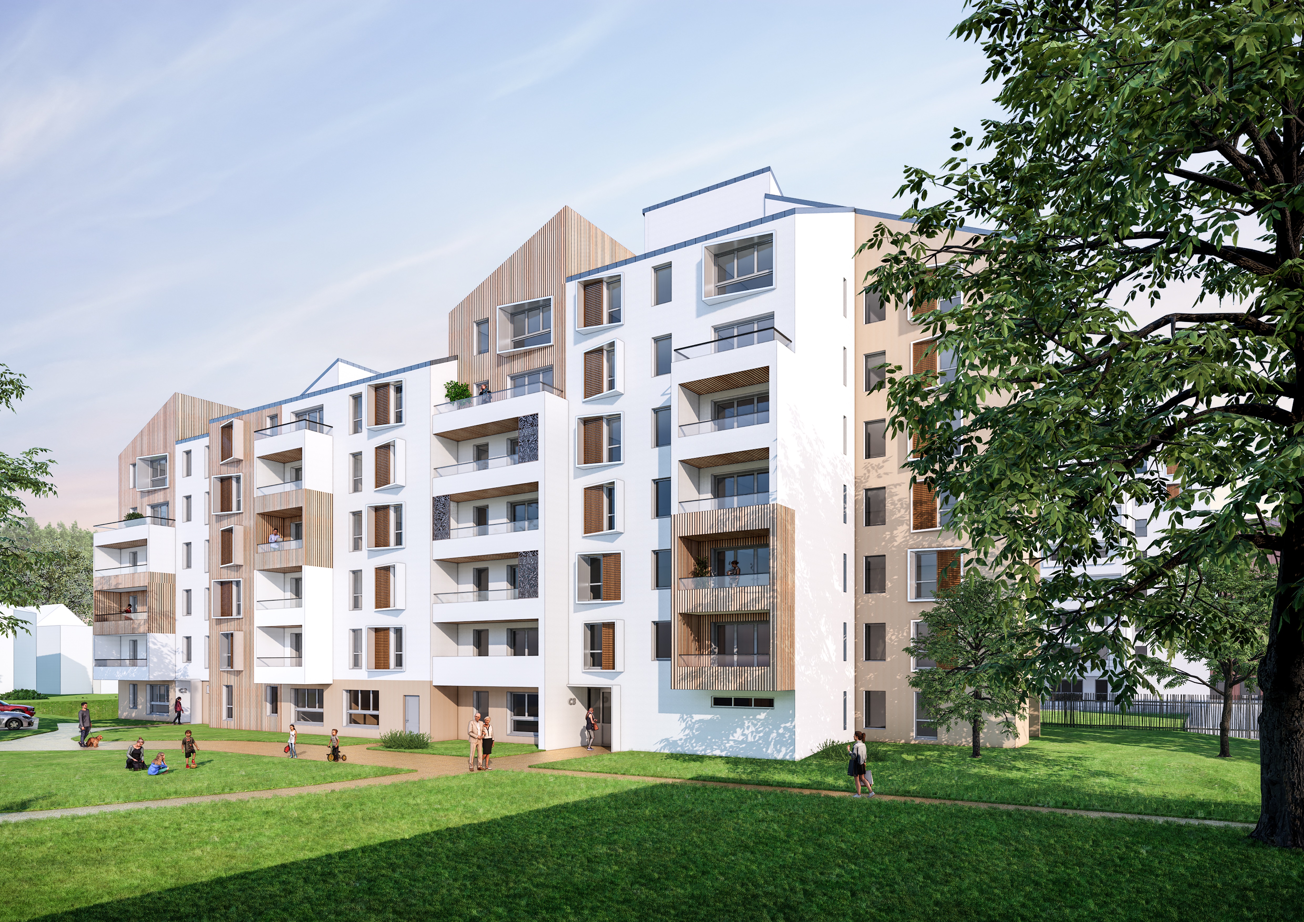 Construit en 1986, le complexe de logements « Les Tilleuls » arbore une architecture peu attractive. Le projet consiste à réhabiliter la résidence en proposant une architecture qualitative et moderne, et à désenclaver le quartier en l’ouvrant à la ville. D’un côté, des commerces et services accessibles constitueront un front de rue, de l’autre, les logements seront isolés de l’activité et du bruit. Les façades seront traitées de manière sobre, grâce à des enduits de deux teintes de beige. Ponctuellement, certaines avancées seront mises en valeur par un habillage de zinc prépatiné et de bardages composites chaleureux. Enfin, la trame verte urbaine sera renforcée par l’implantation d’arbres et de haies.